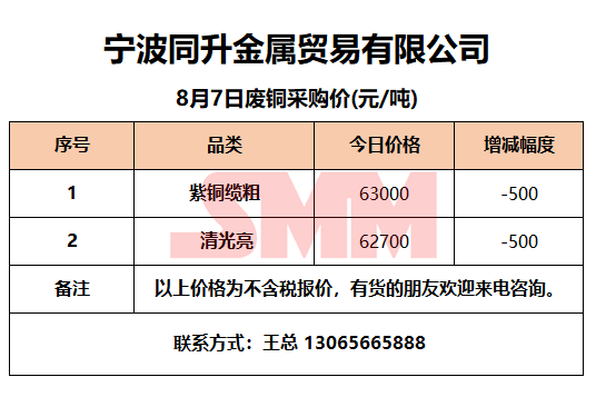 8月7日同升金属 废铜采购报价