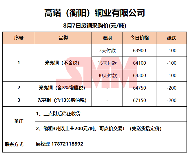 8月7日高诺(衡阳)铜业 废铜采购报价