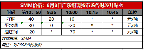 8月8日广东铜现货市场各时段升贴水(第二时段10:00)【SMM价格】