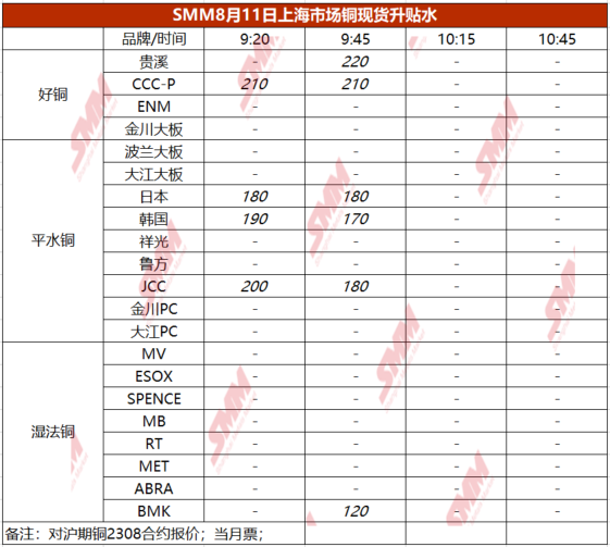 8月11日上海市场铜现货升贴水(第二时段)【SMM价格】