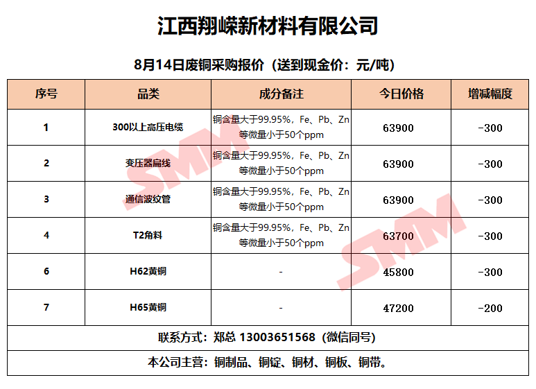 8月14日江西翔嵘新材料 废铜采购报价