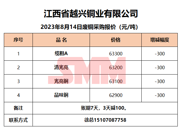 8月14日江西越兴 废铜采购报价