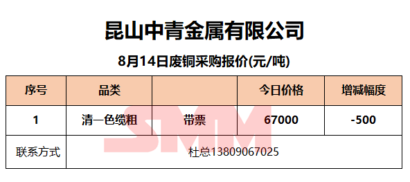 8月14日昆山中青 废铜采购报价