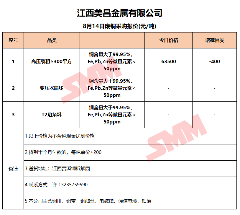 8月14日江西美昌 废铜采购报价