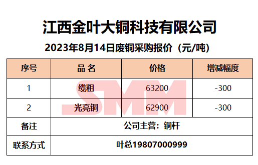 8月14日江西金叶大铜 废铜采购报价