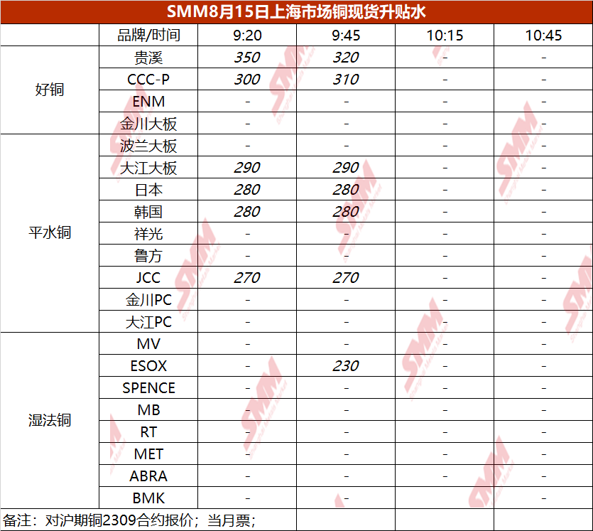 8月15日上海市场铜现货升贴水(第二时段)【SMM价格】