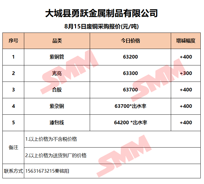 8月15日大城勇跃 废铜采购报价