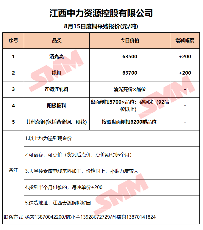 8月15日江西中力 废铜采购报价