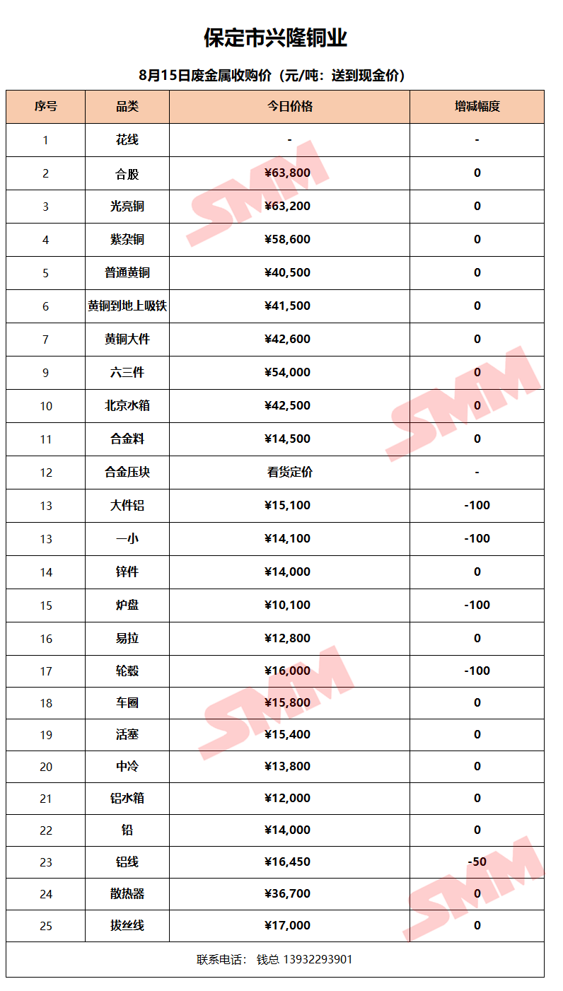 8月15日保定兴隆铜业 废金属收购报价