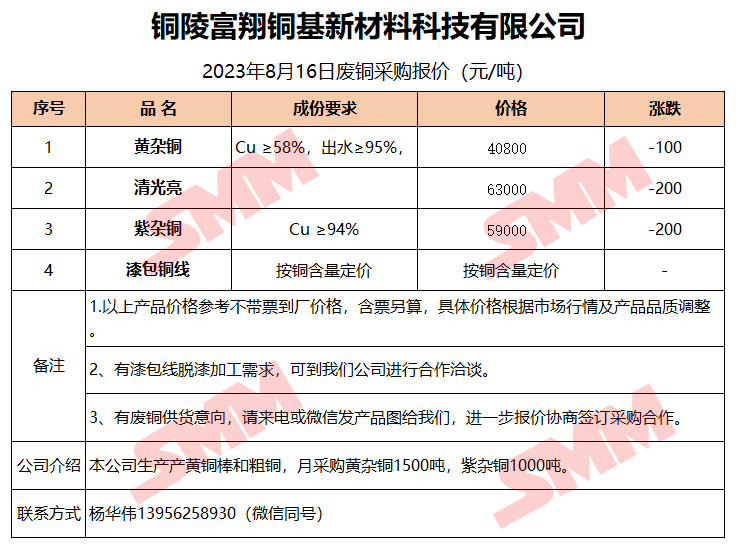8月16日铜陵富翔 废铜采购报价