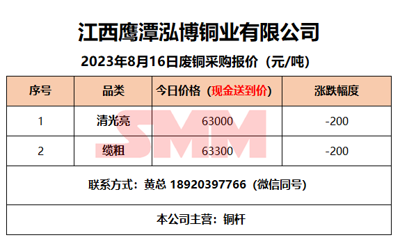 8月16日江西鹰潭泓博铜业 废铜采购报价