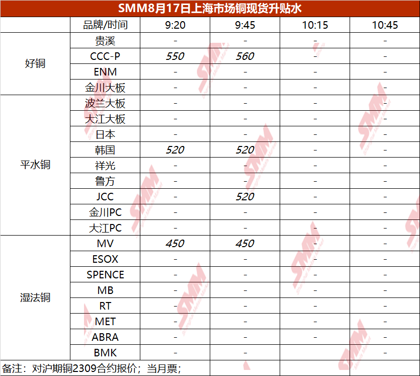 8月17日上海市场铜现货升贴水(第二时段)【SMM价格】