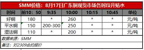 8月17日广东铜现货市场各时段升贴水(第二时段10:00)【SMM价格】