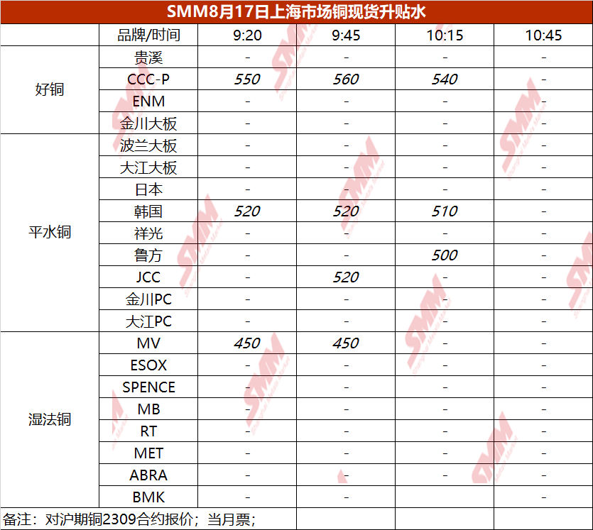8月17日上海市场铜现货升贴水(第三时段)【SMM价格】