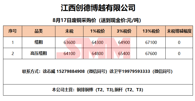 8月17日江西创德博越 废铜采购报价