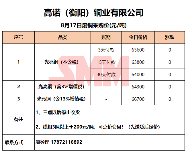 8月17日高诺(衡阳)铜业 废铜采购报价