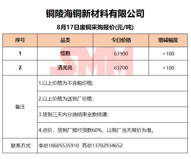 8月17日铜陵海铜 废铜采购报价