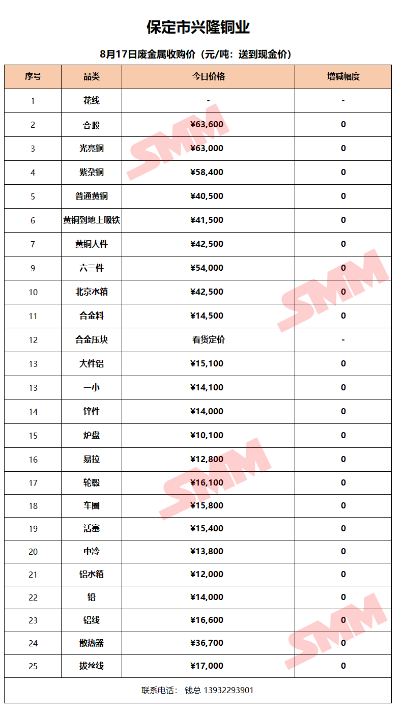 8月17日保定兴隆铜业 废金属收购报价