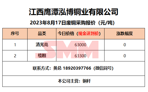 8月17日江西鹰潭泓博铜业 废铜采购报价