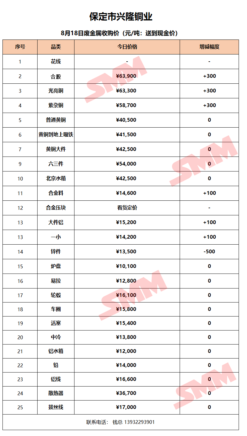 8月18日保定兴隆铜业 废金属收购报价
