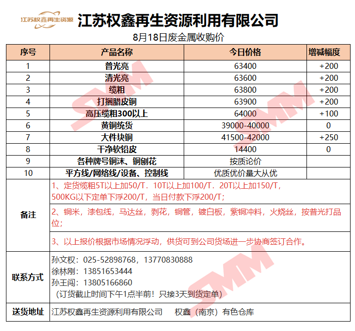 8月18日江苏权鑫 废金属收购报价