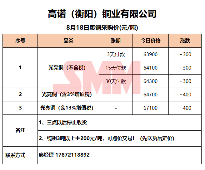 8月18日高诺(衡阳)铜业 废铜采购报价
