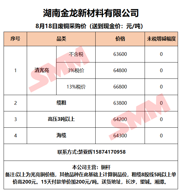 8月18日湖南金龙 废铜采购报价