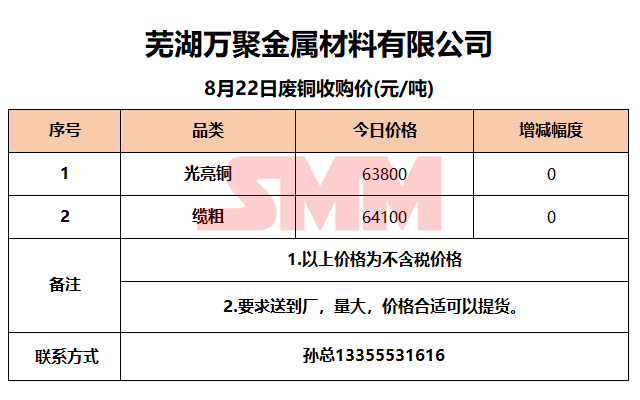 8月22日芜湖万聚金属 废铜收购报价