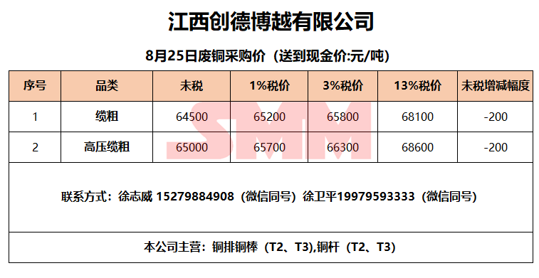 8月25日江西创德博越 废铜采购报价