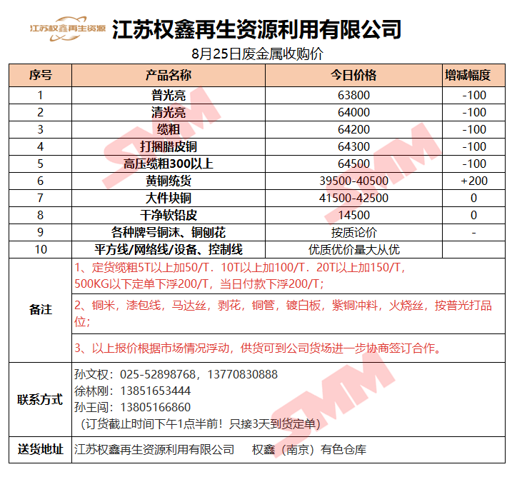 8月25日江苏权鑫 废金属收购报价