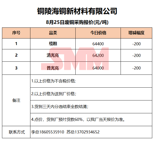 8月25日铜陵海铜 废铜采购报价