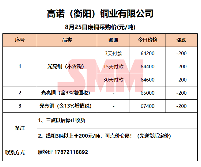 8月25日高诺(衡阳)铜业 废铜采购报价