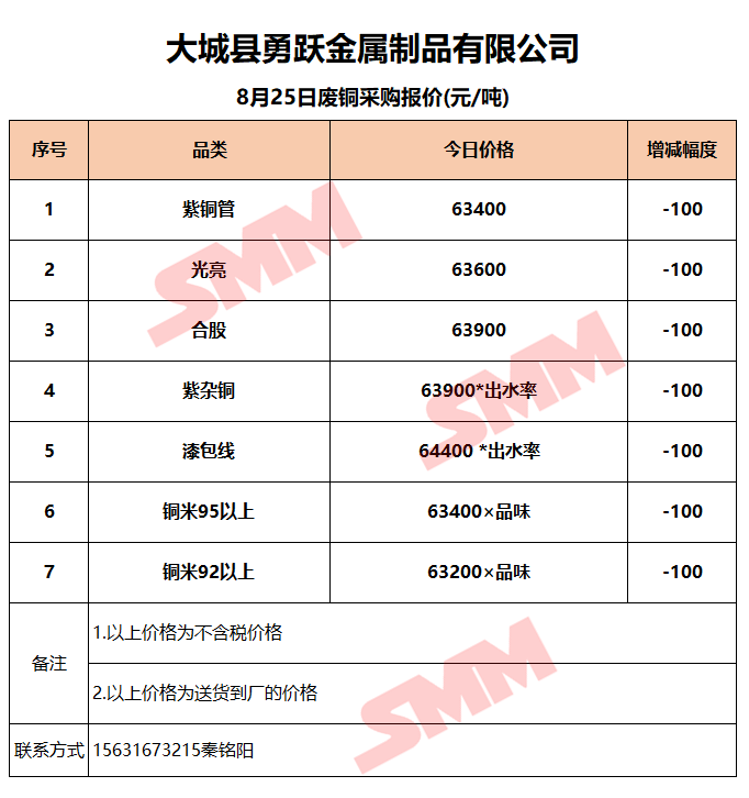 8月25日大城勇跃 废铜采购报价