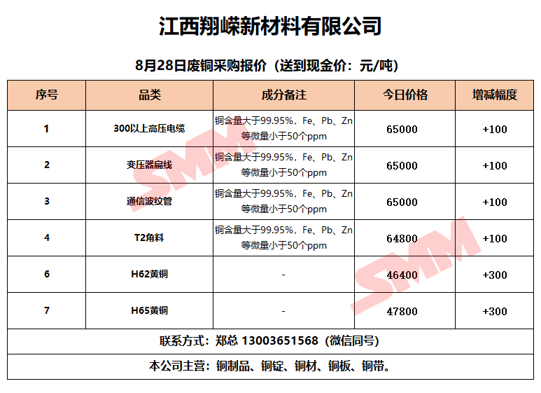 8月28日江西翔嵘新材料 废铜采购报价