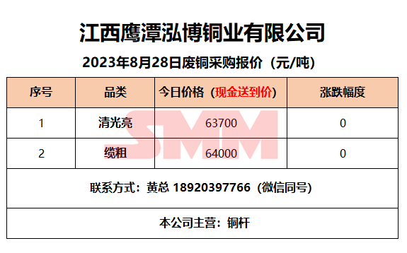 8月28日江西鹰潭泓博铜业 废铜采购报价