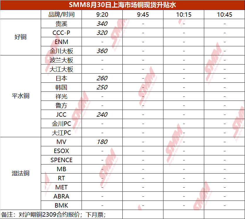 8月30日上海市场铜现货升贴水(第一时段)【SMM价格】