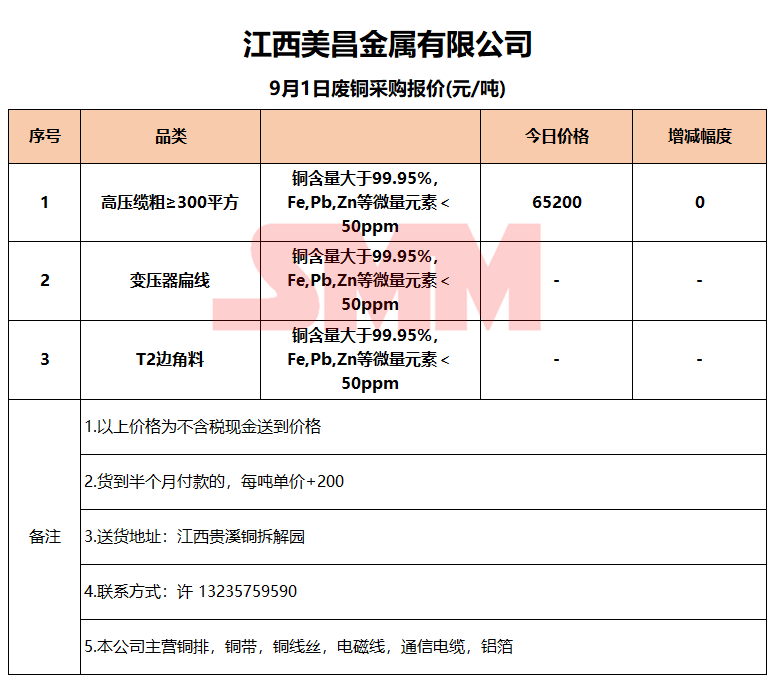 9月1日江西美昌 废铜采购报价