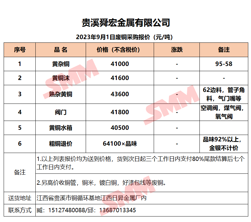 9月1日贵溪舜宏 废铜采购报价