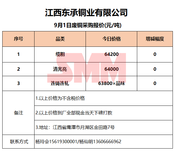 9月1日江西东承 废铜采购报价