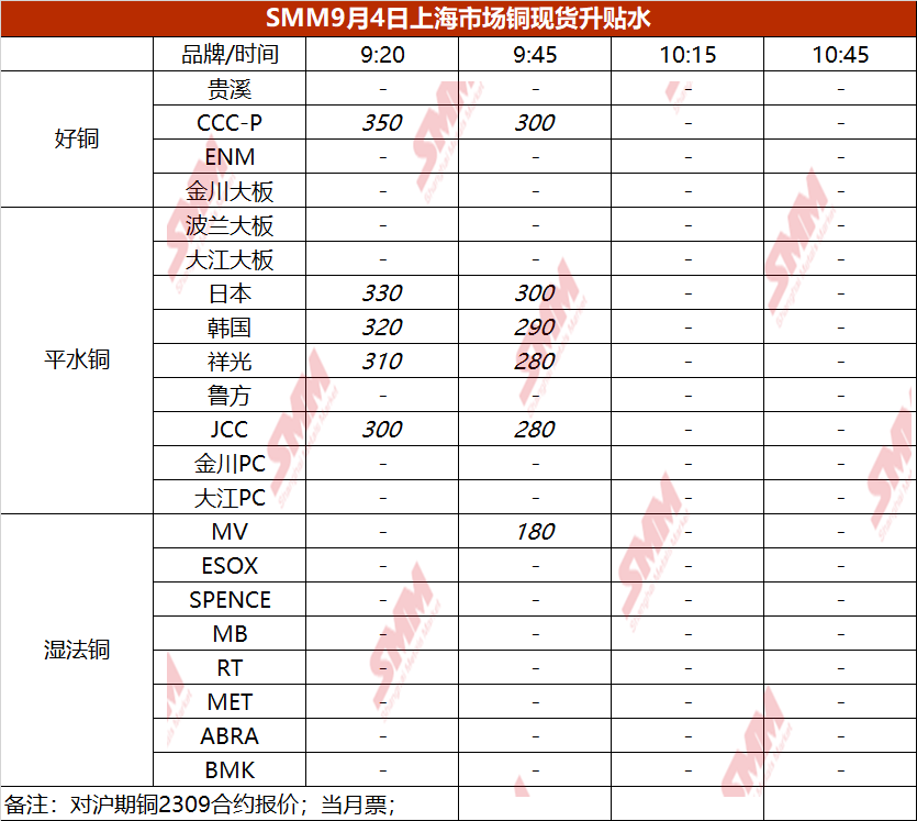 9月4日上海市场铜现货升贴水(第二时段)【SMM价格】