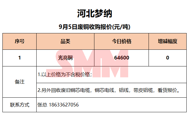 9月5日河北梦纳 废铜收购报价