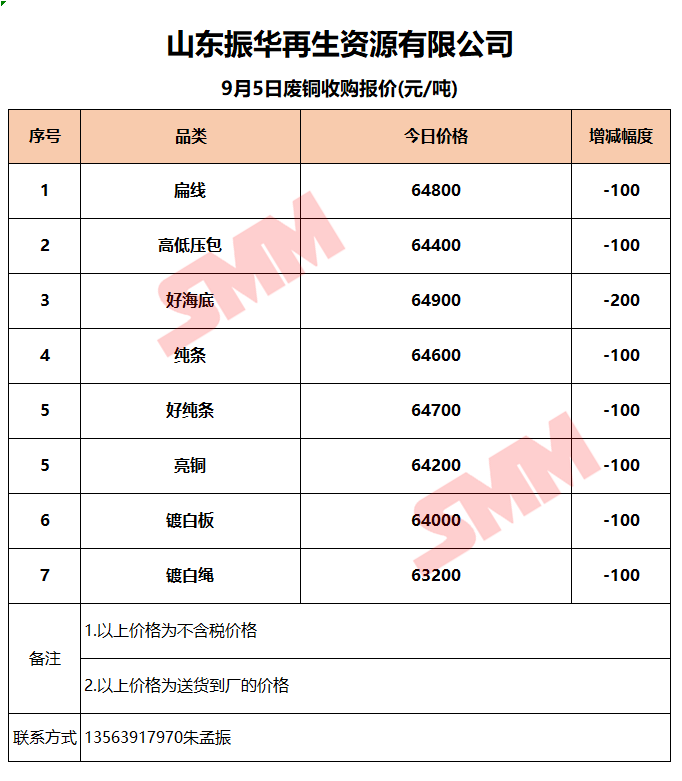 9月5日山东振华 废铜收购报价