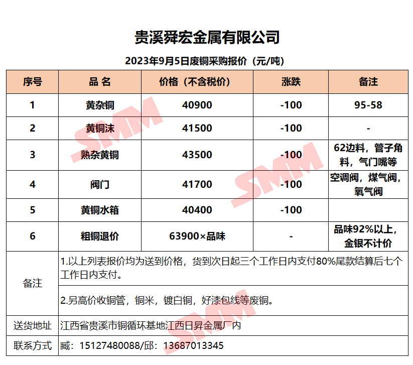 9月5日贵溪舜宏 废铜采购报价