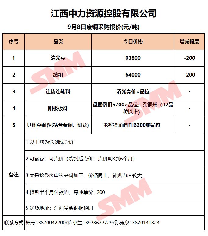 9月8日江西中力 废铜采购报价