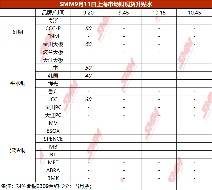 9月11日上海市场铜现货升贴水(第一时段)【SMM价格】