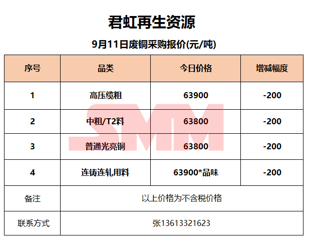 9月11日君虹再生资源 废铜收购报价