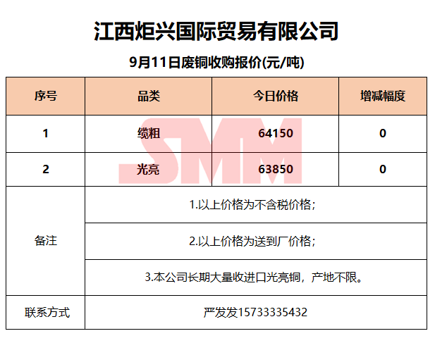 9月11日江西炬兴 废铜收购报价