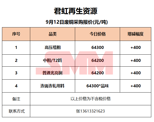 9月12日君虹再生资源 废铜收购报价