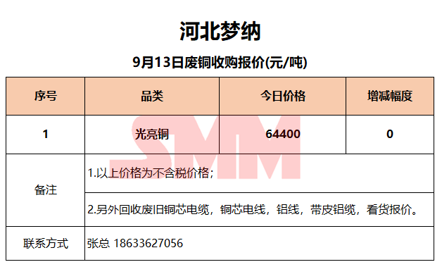 9月13日河北梦纳 废铜收购报价