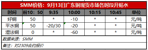 9月13日广东铜现货市场各时段升贴水(第二时段10:00)【SMM价格】